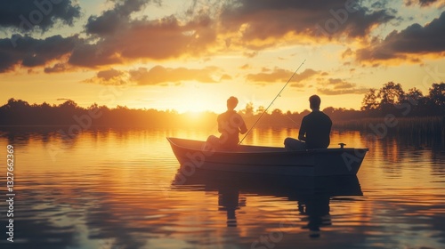 Young man fishing on a lake from the boat at sunset. Generative Ai