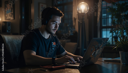 Young man focuses on laptop at his desk in a dimly lit room, working remotely during the late evening with his headphones on.