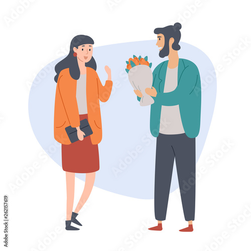 Young man gives a flovers to his girlfriend. Congratulation, celebration, love, relationship.