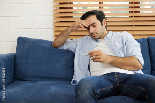 young man have a high fever from checking a digital thermometer measure body temperature at home