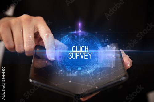 Young man holding a foldable smartphone with QUICK SURVEY inscription, educational concept
