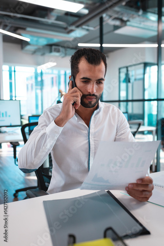 Young man holding smartphone and reviewing report with charts at open plan office desk