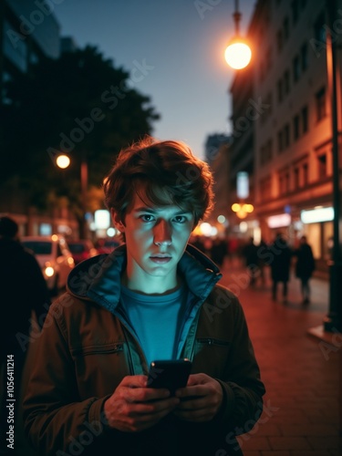 Young Man Illuminated by Smartphone in Urban Night Scene