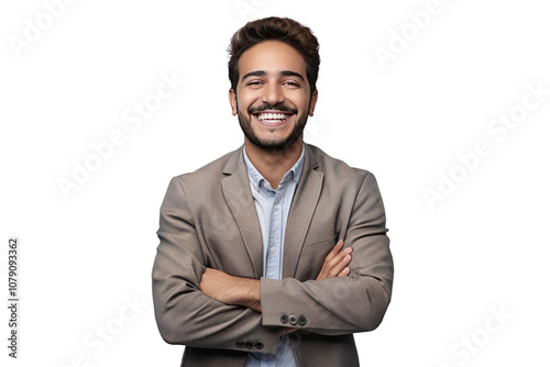 Young man in a blazer, smiling with arms crossed, against a transparent background.