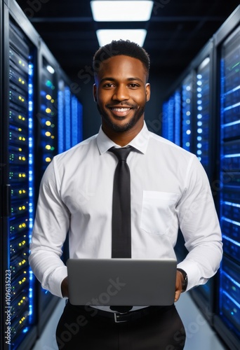 Young man in a data center, professional attire, holding a laptop, smiling, surrounded by server racks, modern technology environment, well-lit, confident expression, high-tech setting.