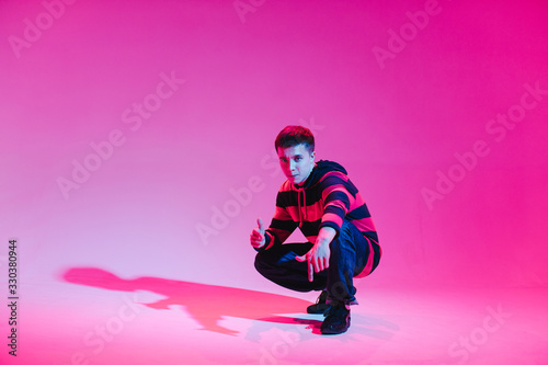 Young Man in a Jumper Dancing Contemporary Dance in Studio. Breakdancing. Dance School Poster. Copy Space. Battle competition announcement. Pink and Blue Background.
