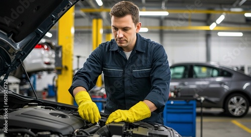 young man in car, Mechanic works on car in garage with open hood. Man in blue jacket, yellow gloves repairs engine in clean organized automotive workshop with many cars surrounding. Vehicle maintenanc