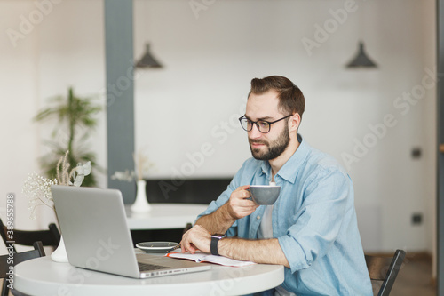 Young man in eyeglasses sitting alone at table in coffee shop cafe restaurant indoors working or studying on laptop pc computer hold cup of coffee or tea. Freelance mobile office business concept.