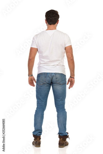 Young Man In Jeans And WhiteT-shirt Is Standing Relaxed, Rear View