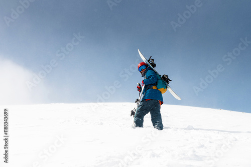 Young man in mountains ready to go snowboarding. Man carrying sports equipment climbing mountain in winter, backcountry