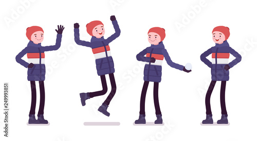 Young man in striped down jacket, positive emotions, wearing soft warm winter clothes, classic snow boots, hat. Men outfit concept. Vector flat style cartoon illustration isolated, white background