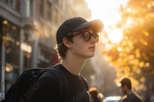 Young Man in Sunglasses and Cap Walking Through Urban Street at Sunset