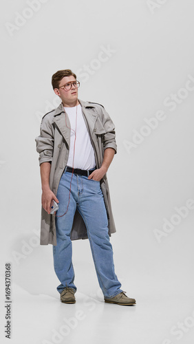 Young man in trench coat listening to music with retro cassette player and glasses. Concept of vintage fashion, nostalgia, urban lifestyle and 80s youth culture.