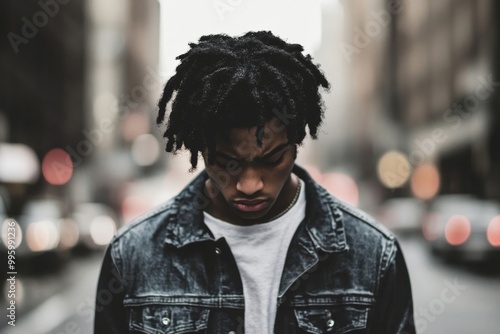 Young Man in Urban Setting with Denim Jacket: Capturing Moody Vibes on a City Street
