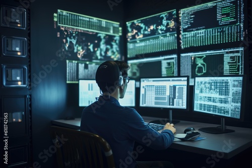 Young man in virtual reality headset working on computer in dark room. An IT specialist rear view working on a personal data security, AI Generated