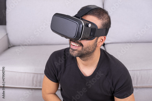 Young man in VR glasses headset at home interacting with virtual reality, smiling. close up. future technology, education video gaming