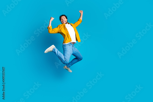 Young man joyfully jumping in mid air while expressing excitement on a vibrant blue background wearing casual yellow attire