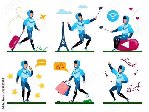Young Man Life Entertainments and Activities Trendy Flat Vector Concepts Set. Guy Traveling with Airlines, Making Selfie in Foreign Country, Recording Mobile Videos, Enjoying Shopping Illustration