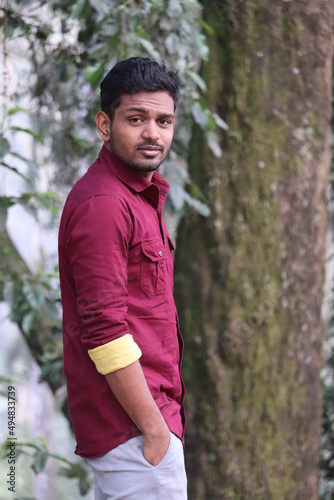 young man looking left and hand in pockets in outdoor