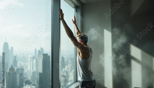 young man looking out window just wake up in the morning