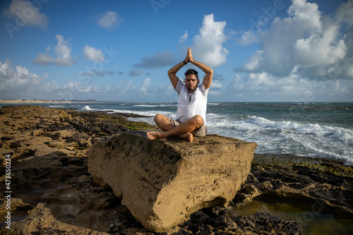 Young man of hippie appearance doing yoga on a beach.