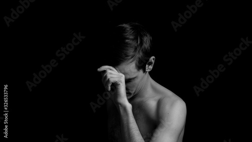 young man on a black background in a dramatic expressive pose