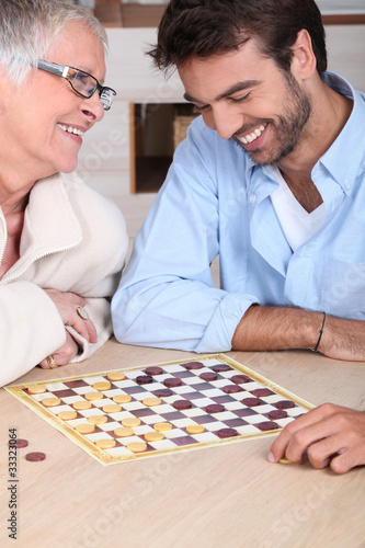 young man playing checkers with older woman