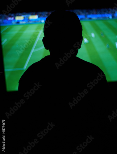 Young man playing computer games in dark room.