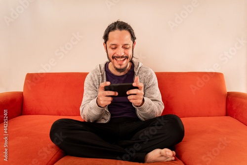 Young man playing gaming on the smart phone sitting on an orange sofa couch at home in the living room