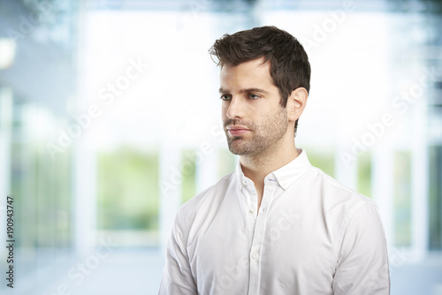 Young man portrait. Portrait of handsome young businessman looking at camera while standing at office.