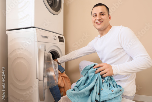 Young man putting dirty clothes into washing machine in laundry room