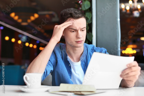 Young man reading letter at table in cafe. Mail delivery