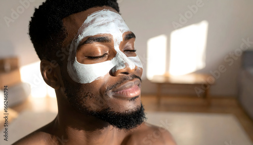 Young Man Relaxing with Facial Mask in Bright Minimalist Room Indulging in Self-Care