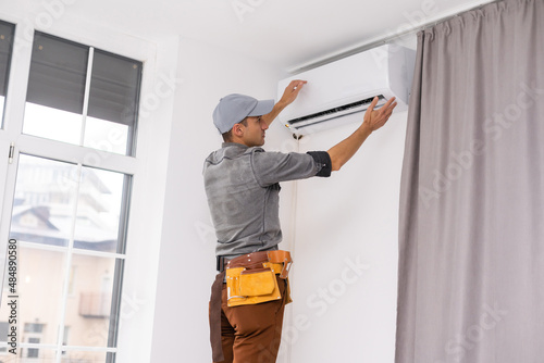 Young Man Repairing Air Conditioner Standing On Stepladder