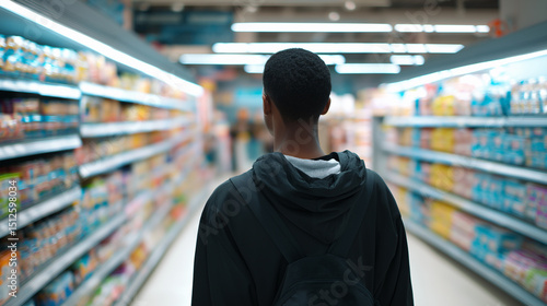 Young man seen from behind standing in a brightly lit supermarket aisle surrounded by shelves full of packaged food products.
