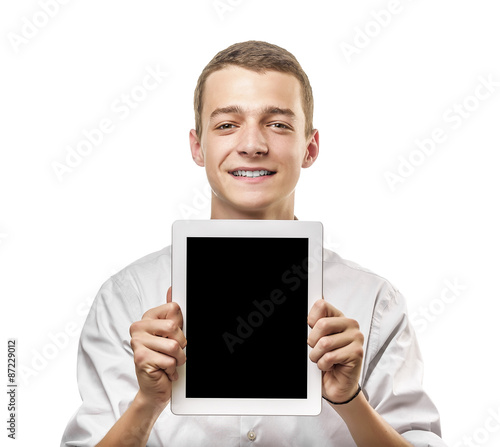Young man showing tablet pc.