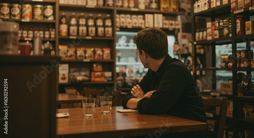 Young man sitting at wooden table with glasses, looking away in a rustic shop or cafe, cozy ambiance for gathering.
