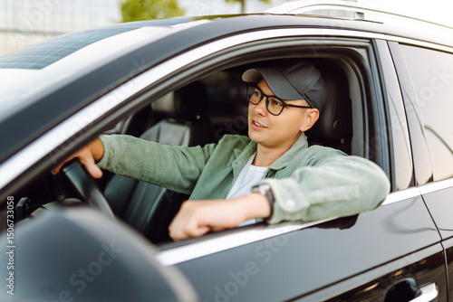 Young man sitting behind the wheel of the car, enjoying the sunny weather, looking out the window. Stylish car driver with an open window. Transport, car travel concept.