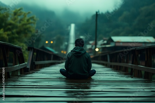 Young man sitting on a wooden bridge in autumn forest, wearing casual outfit and beanie hat, thoughtful outdoor portrait