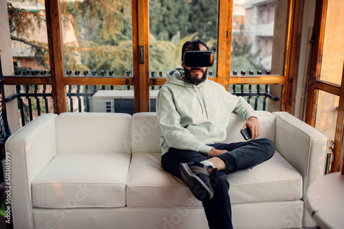 Young man sitting on couch in room wearing VR glasses using innovative futuristic technologies spending time at home
