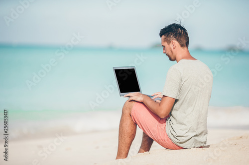 Young man sitting on sand with laptop on tropical caribbean beach. Man with computer and working on the beach