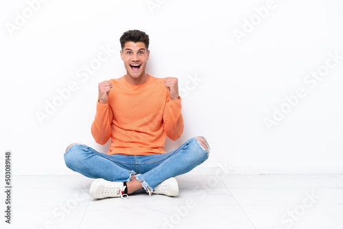 Young man sitting on the floor isolated on white background celebrating a victory in winner position