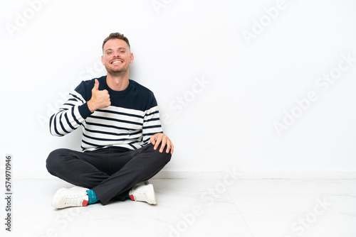Young man sitting on the floor isolated on white background giving a thumbs up gesture