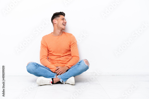 Young man sitting on the floor isolated on white background laughing in lateral position