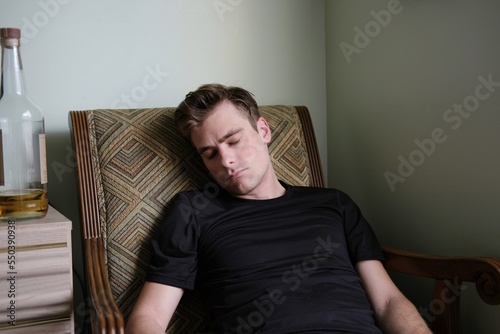 young man sleeping in an armchair near a bottle of alcohol