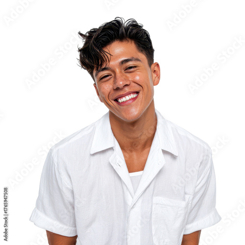 Young man smiling brightly in casual white shirt against plain background isolated on transparent background