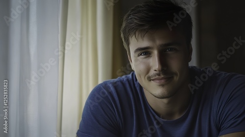 Young man smiling warmly, soft light enhancing his cheerful expression, minimal background.