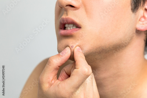 young man squeezing a pimple, men's skincare concept