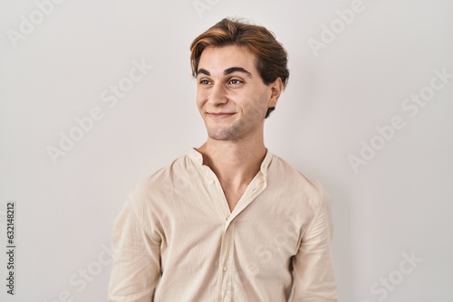 Young man standing over isolated background smiling looking to the side and staring away thinking.