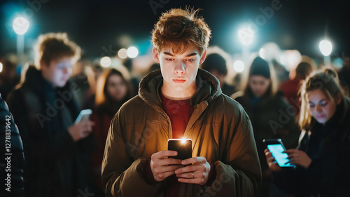 young man stands in crowd, illuminated by his phone, surrounded by people using their devices. atmosphere is vibrant and engaging, highlighting connection through technology